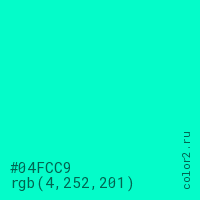 Цвет #04FCC9 в цветовой модели RGB обозначается тремя октетами (4, 252, 201) в десятичном формате и #04FCC9 в шестнадцатиричном (hex) формате, которые являются интенсивностью красного 4 (hex 04), интенсивность зелёного 252 (hex FC) и интенсивность синего 201 (hex C9).