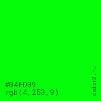 Цвет #04FD09 в цветовой модели RGB обозначается тремя октетами (4, 253, 9) в десятичном формате и #04FD09 в шестнадцатиричном (hex) формате, которые являются интенсивностью красного 4 (hex 04), интенсивность зелёного 253 (hex FD) и интенсивность синего 9 (hex 09).