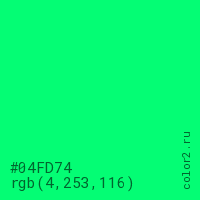 Цвет #04FD74 в цветовой модели RGB обозначается тремя октетами (4, 253, 116) в десятичном формате и #04FD74 в шестнадцатиричном (hex) формате, которые являются интенсивностью красного 4 (hex 04), интенсивность зелёного 253 (hex FD) и интенсивность синего 116 (hex 74).