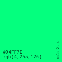 Цвет #04FF7E в цветовой модели RGB обозначается тремя октетами (4, 255, 126) в десятичном формате и #04FF7E в шестнадцатиричном (hex) формате, которые являются интенсивностью красного 4 (hex 04), интенсивность зелёного 255 (hex FF) и интенсивность синего 126 (hex 7E).