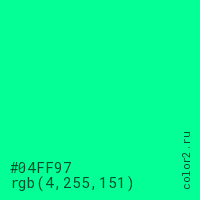 Цвет #04FF97 в цветовой модели RGB обозначается тремя октетами (4, 255, 151) в десятичном формате и #04FF97 в шестнадцатиричном (hex) формате, которые являются интенсивностью красного 4 (hex 04), интенсивность зелёного 255 (hex FF) и интенсивность синего 151 (hex 97).