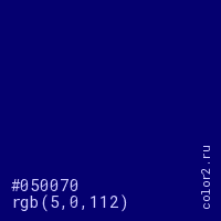 Цвет #050070 в цветовой модели RGB обозначается тремя октетами (5, 0, 112) в десятичном формате и #050070 в шестнадцатиричном (hex) формате, которые являются интенсивностью красного 5 (hex 05), интенсивность зелёного 0 (hex 00) и интенсивность синего 112 (hex 70).