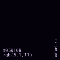 Цвет #05010B в цветовой модели RGB обозначается тремя октетами (5, 1, 11) в десятичном формате и #05010B в шестнадцатиричном (hex) формате, которые являются интенсивностью красного 5 (hex 05), интенсивность зелёного 1 (hex 01) и интенсивность синего 11 (hex 0B).
