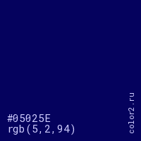 Цвет #05025E в цветовой модели RGB обозначается тремя октетами (5, 2, 94) в десятичном формате и #05025E в шестнадцатиричном (hex) формате, которые являются интенсивностью красного 5 (hex 05), интенсивность зелёного 2 (hex 02) и интенсивность синего 94 (hex 5E).