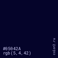 Цвет #05042A в цветовой модели RGB обозначается тремя октетами (5, 4, 42) в десятичном формате и #05042A в шестнадцатиричном (hex) формате, которые являются интенсивностью красного 5 (hex 05), интенсивность зелёного 4 (hex 04) и интенсивность синего 42 (hex 2A).