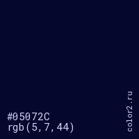 Цвет #05072C в цветовой модели RGB обозначается тремя октетами (5, 7, 44) в десятичном формате и #05072C в шестнадцатиричном (hex) формате, которые являются интенсивностью красного 5 (hex 05), интенсивность зелёного 7 (hex 07) и интенсивность синего 44 (hex 2C).