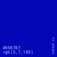 Цвет #0507B7 в цветовой модели RGB обозначается тремя октетами (5, 7, 183) в десятичном формате и #0507B7 в шестнадцатиричном (hex) формате, которые являются интенсивностью красного 5 (hex 05), интенсивность зелёного 7 (hex 07) и интенсивность синего 183 (hex B7).