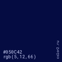 Цвет #050C42 в цветовой модели RGB обозначается тремя октетами (5, 12, 66) в десятичном формате и #050C42 в шестнадцатиричном (hex) формате, которые являются интенсивностью красного 5 (hex 05), интенсивность зелёного 12 (hex 0C) и интенсивность синего 66 (hex 42).