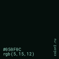 Цвет #050F0C в цветовой модели RGB обозначается тремя октетами (5, 15, 12) в десятичном формате и #050F0C в шестнадцатиричном (hex) формате, которые являются интенсивностью красного 5 (hex 05), интенсивность зелёного 15 (hex 0F) и интенсивность синего 12 (hex 0C).