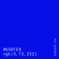 Цвет #050FE8 в цветовой модели RGB обозначается тремя октетами (5, 15, 232) в десятичном формате и #050FE8 в шестнадцатиричном (hex) формате, которые являются интенсивностью красного 5 (hex 05), интенсивность зелёного 15 (hex 0F) и интенсивность синего 232 (hex E8).