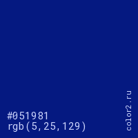 Цвет #051981 в цветовой модели RGB обозначается тремя октетами (5, 25, 129) в десятичном формате и #051981 в шестнадцатиричном (hex) формате, которые являются интенсивностью красного 5 (hex 05), интенсивность зелёного 25 (hex 19) и интенсивность синего 129 (hex 81).