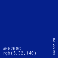 Цвет #05208C в цветовой модели RGB обозначается тремя октетами (5, 32, 140) в десятичном формате и #05208C в шестнадцатиричном (hex) формате, которые являются интенсивностью красного 5 (hex 05), интенсивность зелёного 32 (hex 20) и интенсивность синего 140 (hex 8C).