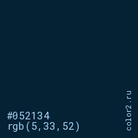 Цвет #052134 в цветовой модели RGB обозначается тремя октетами (5, 33, 52) в десятичном формате и #052134 в шестнадцатиричном (hex) формате, которые являются интенсивностью красного 5 (hex 05), интенсивность зелёного 33 (hex 21) и интенсивность синего 52 (hex 34).