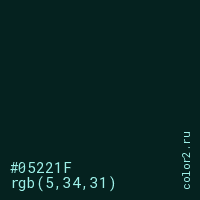 Цвет #05221F в цветовой модели RGB обозначается тремя октетами (5, 34, 31) в десятичном формате и #05221F в шестнадцатиричном (hex) формате, которые являются интенсивностью красного 5 (hex 05), интенсивность зелёного 34 (hex 22) и интенсивность синего 31 (hex 1F).