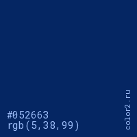 Цвет #052663 в цветовой модели RGB обозначается тремя октетами (5, 38, 99) в десятичном формате и #052663 в шестнадцатиричном (hex) формате, которые являются интенсивностью красного 5 (hex 05), интенсивность зелёного 38 (hex 26) и интенсивность синего 99 (hex 63).