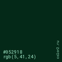 Цвет #052918 в цветовой модели RGB обозначается тремя октетами (5, 41, 24) в десятичном формате и #052918 в шестнадцатиричном (hex) формате, которые являются интенсивностью красного 5 (hex 05), интенсивность зелёного 41 (hex 29) и интенсивность синего 24 (hex 18).