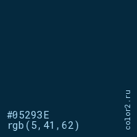 Цвет #05293E в цветовой модели RGB обозначается тремя октетами (5, 41, 62) в десятичном формате и #05293E в шестнадцатиричном (hex) формате, которые являются интенсивностью красного 5 (hex 05), интенсивность зелёного 41 (hex 29) и интенсивность синего 62 (hex 3E).