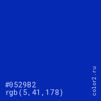 Цвет #0529B2 в цветовой модели RGB обозначается тремя октетами (5, 41, 178) в десятичном формате и #0529B2 в шестнадцатиричном (hex) формате, которые являются интенсивностью красного 5 (hex 05), интенсивность зелёного 41 (hex 29) и интенсивность синего 178 (hex B2).