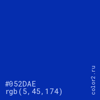 Цвет #052DAE в цветовой модели RGB обозначается тремя октетами (5, 45, 174) в десятичном формате и #052DAE в шестнадцатиричном (hex) формате, которые являются интенсивностью красного 5 (hex 05), интенсивность зелёного 45 (hex 2D) и интенсивность синего 174 (hex AE).