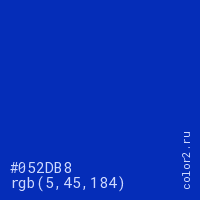 Цвет #052DB8 в цветовой модели RGB обозначается тремя октетами (5, 45, 184) в десятичном формате и #052DB8 в шестнадцатиричном (hex) формате, которые являются интенсивностью красного 5 (hex 05), интенсивность зелёного 45 (hex 2D) и интенсивность синего 184 (hex B8).