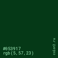 Цвет #053917 в цветовой модели RGB обозначается тремя октетами (5, 57, 23) в десятичном формате и #053917 в шестнадцатиричном (hex) формате, которые являются интенсивностью красного 5 (hex 05), интенсивность зелёного 57 (hex 39) и интенсивность синего 23 (hex 17).