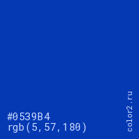 Цвет #0539B4 в цветовой модели RGB обозначается тремя октетами (5, 57, 180) в десятичном формате и #0539B4 в шестнадцатиричном (hex) формате, которые являются интенсивностью красного 5 (hex 05), интенсивность зелёного 57 (hex 39) и интенсивность синего 180 (hex B4).