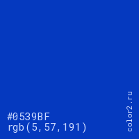 Цвет #0539BF в цветовой модели RGB обозначается тремя октетами (5, 57, 191) в десятичном формате и #0539BF в шестнадцатиричном (hex) формате, которые являются интенсивностью красного 5 (hex 05), интенсивность зелёного 57 (hex 39) и интенсивность синего 191 (hex BF).