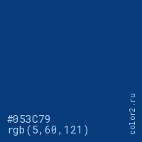 Цвет #053C79 в цветовой модели RGB обозначается тремя октетами (5, 60, 121) в десятичном формате и #053C79 в шестнадцатиричном (hex) формате, которые являются интенсивностью красного 5 (hex 05), интенсивность зелёного 60 (hex 3C) и интенсивность синего 121 (hex 79).