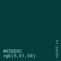 Цвет #053D3C в цветовой модели RGB обозначается тремя октетами (5, 61, 60) в десятичном формате и #053D3C в шестнадцатиричном (hex) формате, которые являются интенсивностью красного 5 (hex 05), интенсивность зелёного 61 (hex 3D) и интенсивность синего 60 (hex 3C).