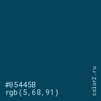 Цвет #05445B в цветовой модели RGB обозначается тремя октетами (5, 68, 91) в десятичном формате и #05445B в шестнадцатиричном (hex) формате, которые являются интенсивностью красного 5 (hex 05), интенсивность зелёного 68 (hex 44) и интенсивность синего 91 (hex 5B).