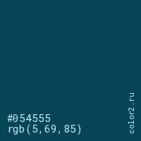 Цвет #054555 в цветовой модели RGB обозначается тремя октетами (5, 69, 85) в десятичном формате и #054555 в шестнадцатиричном (hex) формате, которые являются интенсивностью красного 5 (hex 05), интенсивность зелёного 69 (hex 45) и интенсивность синего 85 (hex 55).