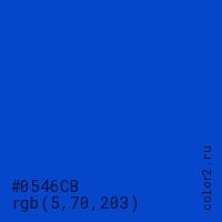Цвет #0546CB в цветовой модели RGB обозначается тремя октетами (5, 70, 203) в десятичном формате и #0546CB в шестнадцатиричном (hex) формате, которые являются интенсивностью красного 5 (hex 05), интенсивность зелёного 70 (hex 46) и интенсивность синего 203 (hex CB).