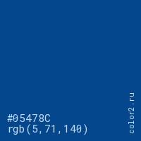 Цвет #05478C в цветовой модели RGB обозначается тремя октетами (5, 71, 140) в десятичном формате и #05478C в шестнадцатиричном (hex) формате, которые являются интенсивностью красного 5 (hex 05), интенсивность зелёного 71 (hex 47) и интенсивность синего 140 (hex 8C).