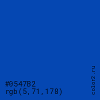 Цвет #0547B2 в цветовой модели RGB обозначается тремя октетами (5, 71, 178) в десятичном формате и #0547B2 в шестнадцатиричном (hex) формате, которые являются интенсивностью красного 5 (hex 05), интенсивность зелёного 71 (hex 47) и интенсивность синего 178 (hex B2).