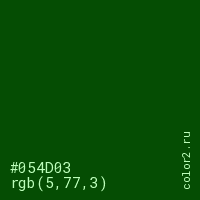 Цвет #054D03 в цветовой модели RGB обозначается тремя октетами (5, 77, 3) в десятичном формате и #054D03 в шестнадцатиричном (hex) формате, которые являются интенсивностью красного 5 (hex 05), интенсивность зелёного 77 (hex 4D) и интенсивность синего 3 (hex 03).