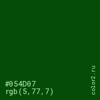 Цвет #054D07 в цветовой модели RGB обозначается тремя октетами (5, 77, 7) в десятичном формате и #054D07 в шестнадцатиричном (hex) формате, которые являются интенсивностью красного 5 (hex 05), интенсивность зелёного 77 (hex 4D) и интенсивность синего 7 (hex 07).