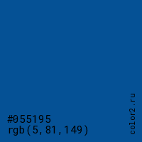 Цвет #055195 в цветовой модели RGB обозначается тремя октетами (5, 81, 149) в десятичном формате и #055195 в шестнадцатиричном (hex) формате, которые являются интенсивностью красного 5 (hex 05), интенсивность зелёного 81 (hex 51) и интенсивность синего 149 (hex 95).