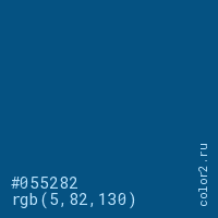Цвет #055282 в цветовой модели RGB обозначается тремя октетами (5, 82, 130) в десятичном формате и #055282 в шестнадцатиричном (hex) формате, которые являются интенсивностью красного 5 (hex 05), интенсивность зелёного 82 (hex 52) и интенсивность синего 130 (hex 82).