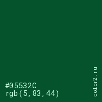 Цвет #05532C в цветовой модели RGB обозначается тремя октетами (5, 83, 44) в десятичном формате и #05532C в шестнадцатиричном (hex) формате, которые являются интенсивностью красного 5 (hex 05), интенсивность зелёного 83 (hex 53) и интенсивность синего 44 (hex 2C).