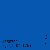 Цвет #0557B0 в цветовой модели RGB обозначается тремя октетами (5, 87, 176) в десятичном формате и #0557B0 в шестнадцатиричном (hex) формате, которые являются интенсивностью красного 5 (hex 05), интенсивность зелёного 87 (hex 57) и интенсивность синего 176 (hex B0).
