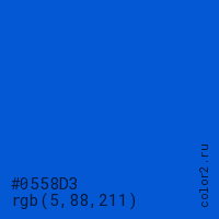 Цвет #0558D3 в цветовой модели RGB обозначается тремя октетами (5, 88, 211) в десятичном формате и #0558D3 в шестнадцатиричном (hex) формате, которые являются интенсивностью красного 5 (hex 05), интенсивность зелёного 88 (hex 58) и интенсивность синего 211 (hex D3).