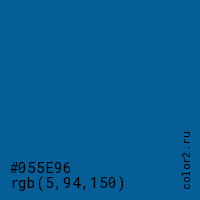 Цвет #055E96 в цветовой модели RGB обозначается тремя октетами (5, 94, 150) в десятичном формате и #055E96 в шестнадцатиричном (hex) формате, которые являются интенсивностью красного 5 (hex 05), интенсивность зелёного 94 (hex 5E) и интенсивность синего 150 (hex 96).