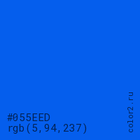 Цвет #055EED в цветовой модели RGB обозначается тремя октетами (5, 94, 237) в десятичном формате и #055EED в шестнадцатиричном (hex) формате, которые являются интенсивностью красного 5 (hex 05), интенсивность зелёного 94 (hex 5E) и интенсивность синего 237 (hex ED).