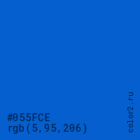 Цвет #055FCE в цветовой модели RGB обозначается тремя октетами (5, 95, 206) в десятичном формате и #055FCE в шестнадцатиричном (hex) формате, которые являются интенсивностью красного 5 (hex 05), интенсивность зелёного 95 (hex 5F) и интенсивность синего 206 (hex CE).
