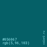 Цвет #056067 в цветовой модели RGB обозначается тремя октетами (5, 96, 103) в десятичном формате и #056067 в шестнадцатиричном (hex) формате, которые являются интенсивностью красного 5 (hex 05), интенсивность зелёного 96 (hex 60) и интенсивность синего 103 (hex 67).