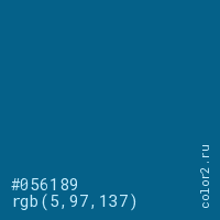 Цвет #056189 в цветовой модели RGB обозначается тремя октетами (5, 97, 137) в десятичном формате и #056189 в шестнадцатиричном (hex) формате, которые являются интенсивностью красного 5 (hex 05), интенсивность зелёного 97 (hex 61) и интенсивность синего 137 (hex 89).