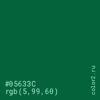 Цвет #05633C в цветовой модели RGB обозначается тремя октетами (5, 99, 60) в десятичном формате и #05633C в шестнадцатиричном (hex) формате, которые являются интенсивностью красного 5 (hex 05), интенсивность зелёного 99 (hex 63) и интенсивность синего 60 (hex 3C).