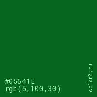 Цвет #05641E в цветовой модели RGB обозначается тремя октетами (5, 100, 30) в десятичном формате и #05641E в шестнадцатиричном (hex) формате, которые являются интенсивностью красного 5 (hex 05), интенсивность зелёного 100 (hex 64) и интенсивность синего 30 (hex 1E).