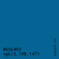 Цвет #056493 в цветовой модели RGB обозначается тремя октетами (5, 100, 147) в десятичном формате и #056493 в шестнадцатиричном (hex) формате, которые являются интенсивностью красного 5 (hex 05), интенсивность зелёного 100 (hex 64) и интенсивность синего 147 (hex 93).