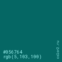 Цвет #056764 в цветовой модели RGB обозначается тремя октетами (5, 103, 100) в десятичном формате и #056764 в шестнадцатиричном (hex) формате, которые являются интенсивностью красного 5 (hex 05), интенсивность зелёного 103 (hex 67) и интенсивность синего 100 (hex 64).
